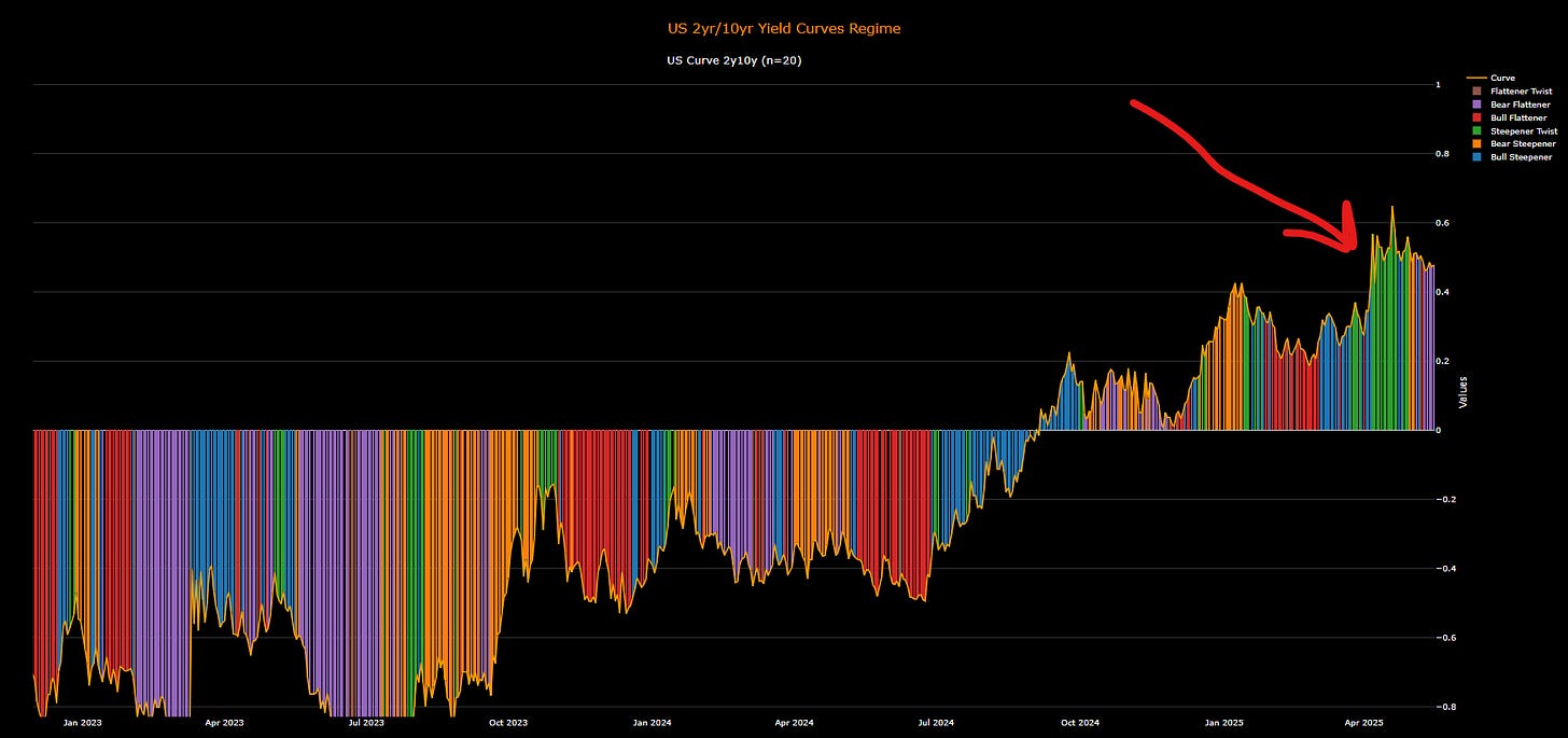 This is WHY understanding the yield curve is so important. Notice that we have gone from a period of steepener twist in the in 2s10s where longer end rates rise as they know a recession isnt happening and moved into a short period of bear flattener. A bear flattener is when bonds are selling off but short end rates are repricing higher than long end rates. In other words, the 2 year is repricing the Fed’s actions MORE than long term nominal GDP is rising (reflected in the 10 year). Now both of these function as an input into each other because the more the short end moves UP, the greater the probability is that rates will put downward pressure on growth and inflation in the long term.