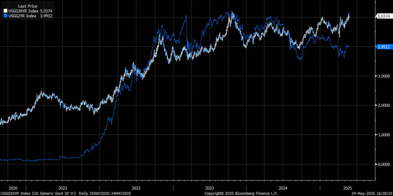 We are in a period of the cycle where the Fed has already cut rates from their highs, and the 2-year is BELOW the long end. We are approaching a critical point because the long end is moving UP as inflation data compresses in a range. Notice that the 30-year has moved up and widened its spread from the short end to reflect higher nominal GDP expectations.