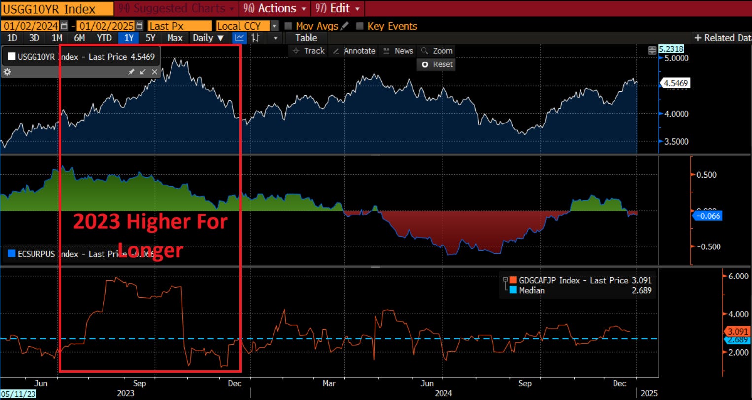 Let me explain in a simpler fashion and connect it to the tangible metrics we use for growth. The chart below is of the 10 year nominal rate (top panel in white), economic surprise index (middle panel in green and red) and the Atlanta Fed GDPnowcast (orange). You will notice in 2023, the LEVEL of growth was much higher. This was one of the reasons it was so difficult for the higher rates to cause a recession. We are now back to the same LEVEL in rates as 2023 except the LEVEL of growth is much lower. The implication is that the risk is much higher for interest rates to transmit into growth and push it lower.