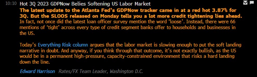 When SLOOS indicate this level of tightness and real rates are this high, there is likely to be some type of growth scare eventually. However, with GDP at 3.87%, it might take a little time. Also, macro always moves REALLY REALLY slow. If you’re running a global macro book, you better match your timeframe with the environment.