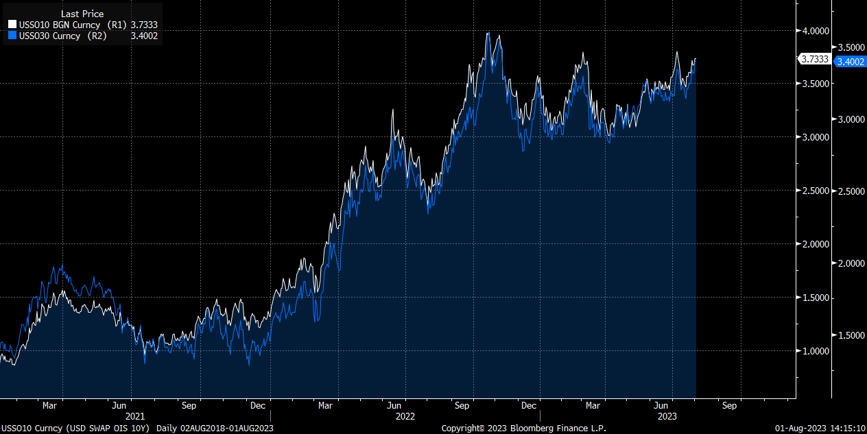 The key thing today on bonds is that September and November Fed fund futures expectations remained largely unchanged. This is why the 2 year moved less than the 30 year.