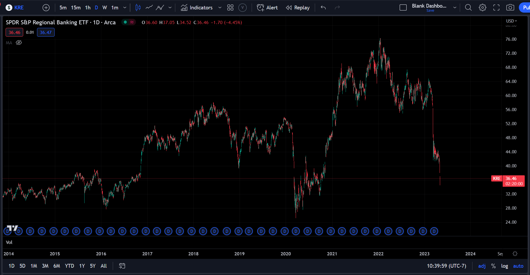 All of this brings us to regional banks. Here is a chart of the regional banking ETF. Nasty chart. It is almost back to the COVID lows.