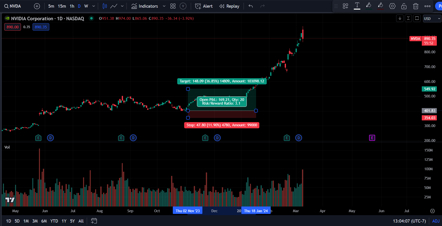 Let’s say last year you wanted to get long NVDA 0.00%↑ last year at 401.83 with stops at 354.03. Now let’s say you have a 100k portfolio and want to risk 1% ($1,000). This would mean buying 20 shares. Ok so you buy 20 shares ($8,036 notional) and NVDA moves up to your profit target of 549.92. If you didn’t run any other trades in your portfolio, you would end with a $3,000 profit and a notional position of $10,998. The total portfolio value would be around $103,000.