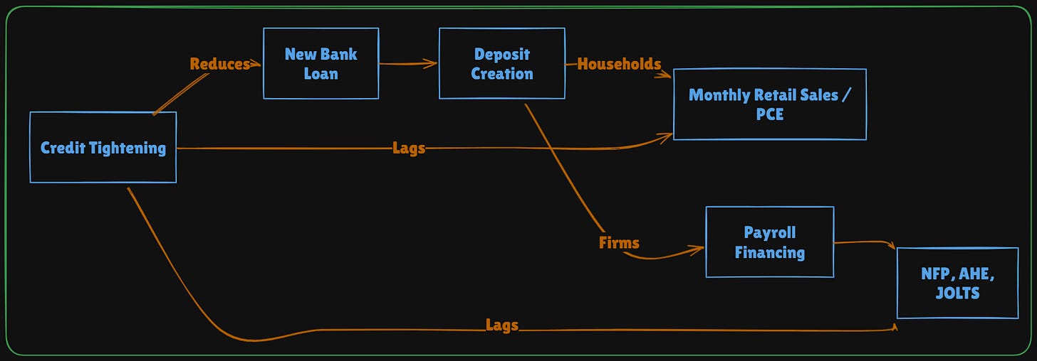 When commercial banks expand balance sheets, new loans create matching deposits that households and firms can spend. Those deposits fund retail sales, PCE, and inventory builds, which appear in Census and BEA data within one-to-two reporting lags. Firms that draw on revolving credit to finance working capital simultaneously expand payrolls, lifting NFP, average hourly earnings, and JOLTS openings. Conversely, tighter credit lines or higher debt-service burdens force cutbacks that filter into these same high-frequency indicators. In short, the banking system’s credit pulse is the leading edge of both consumption and labor data