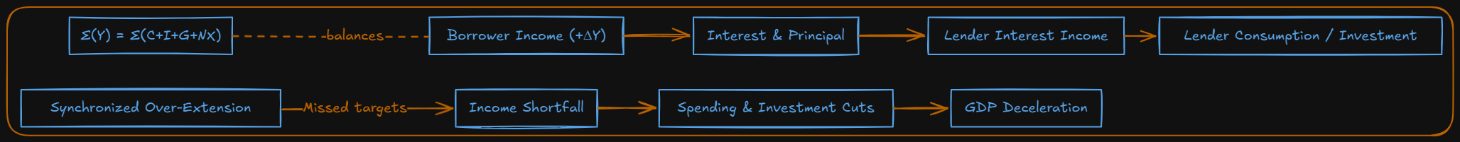 National accounts net to zero: every dollar borrowed to accelerate consumption or capex today appears elsewhere as income to a lender, contractor, or supplier. The danger lies in synchronized over-extension—if many balance sheets rely on the same optimistic growth assumptions, the collective income needed for debt service may fail to materialize, producing a negative feedback loop that compresses spending, profits, and ultimately GDP. Thus credit is the hinge between micro balance-sheet choices and the macro identity C + I + G + NX = Y, dictating whether growth is self-reinforcing or self-limiting.