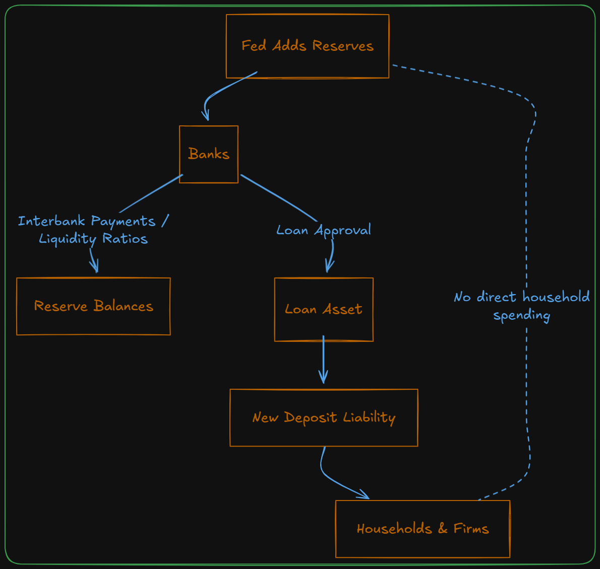 A commercial bank funds each dollar of new lending with a fraction of central-bank reserves and capital; the rest is a self-created deposit liability. That process—asset creation matched by liability creation inside the private sector—is fundamentally different from the Federal Reserve’s open-market operations, which merely swap Treasuries for reserves between the Fed and primary dealers. Reserves stay trapped in the banking system’s plumbing, settling payments and meeting liquidity regs, but they do not finance end-user spending unless a bank chooses to convert reserve capacity into new credit risk.
