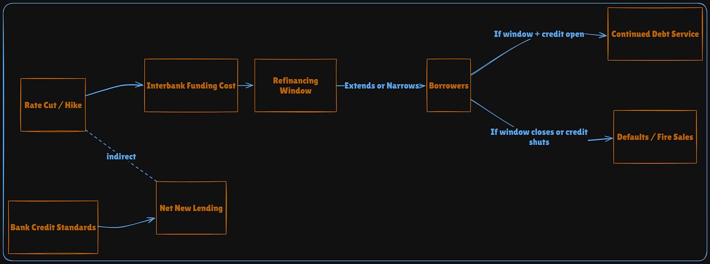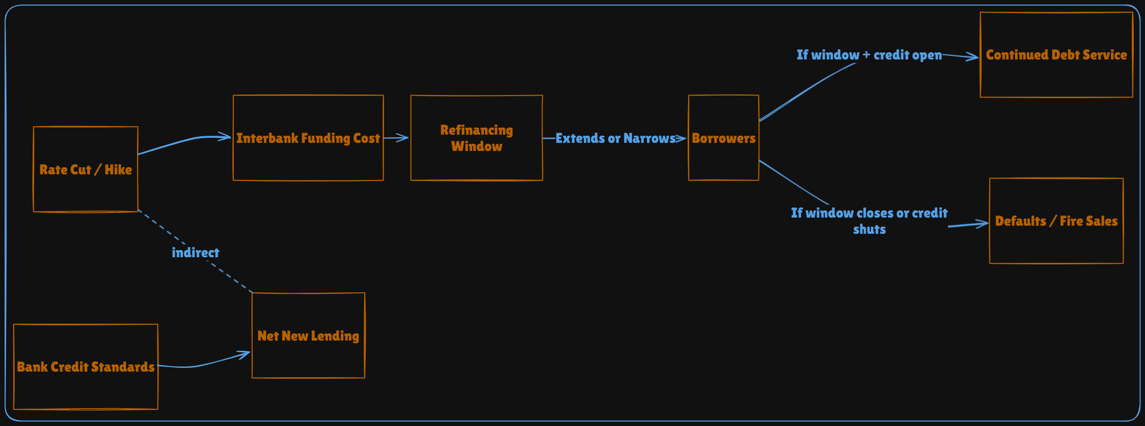 When the Fed cuts, term funding costs fall and liquidity rises, extending the refinancing runway for borrowers whose debts roll in the next 3–12 months; hikes do the opposite. Yet nothing forces banks to originate new loans: credit creation still depends on expected loss-given-default, borrower cash-flow coverage, and collateral values. Defaults or “melt-ups” therefore occur only when the temporal window (maturities coming due) collides with a sudden reassessment of credit risk, not simply with a policy tweak. This dual dependence explains why aggressive hiking cycles can coexist with low default rates—until a maturity wall approaches—or why aggressive cuts sometimes fail to ignite credit booms when banks perceive deteriorating fundamentals.