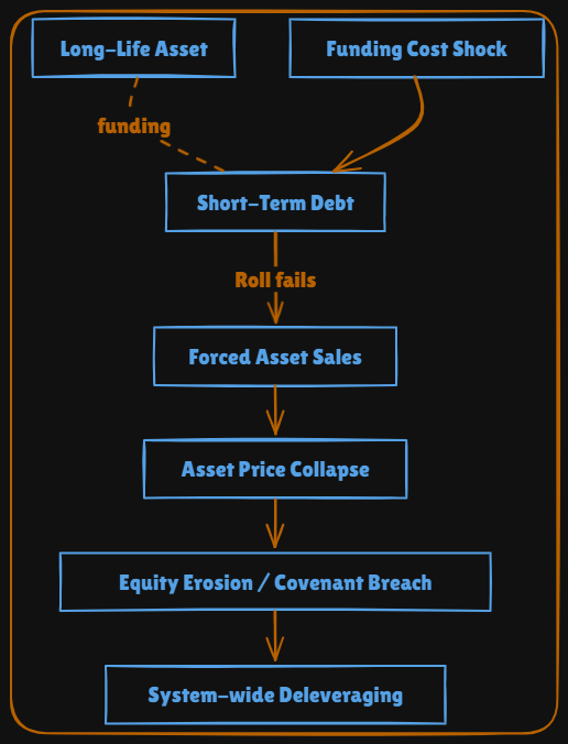 When the life of a borrowed dollar (short-dated liability) is shorter than the cash-flow horizon of the asset it finances, roll-over risk surfaces. A shock to funding costs, collateral values, or operating income forces borrowers to liquidate assets or cut investment prematurely—igniting the classic deleveraging spiral. The problem is structural: a balance-sheet engineered on thin equity and aggressive short-term leverage becomes hypersensitive to volatility spikes, margin calls, and policy tightening, irrespective of how “low” aggregate credit growth might appear ex-post.