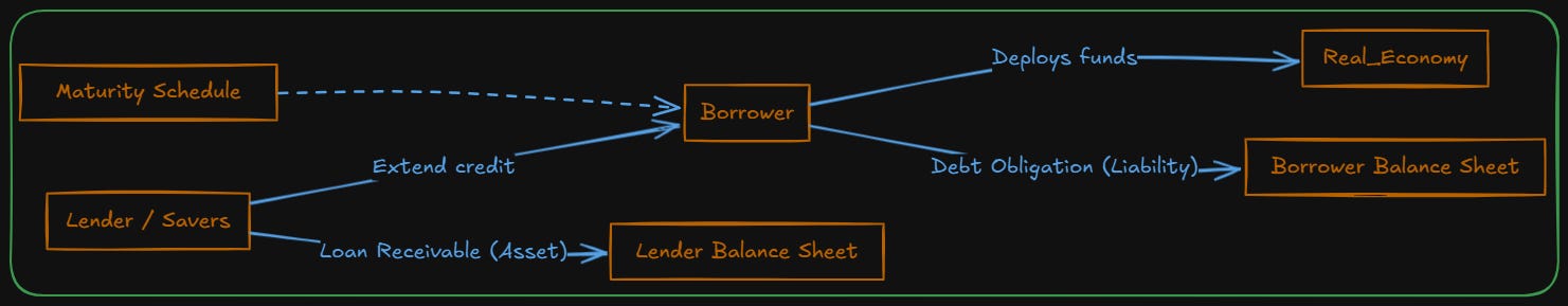Credit transforms current surplus savings into future cash-flow claims: the lender books a receivable (asset) while the borrower records a payable (liability). Because repayment is locked to a specific maturity schedule, credit instantly embeds a temporal constraint on the real economy—capital deployed today must generate cash flows tomorrow sufficient to service both principal and interest. In competitive markets, this constraint disciplines firms and nations alike: those that deploy borrowed funds into projects with sub-par risk-adjusted returns will see funding costs rise, eroding margin and market share.