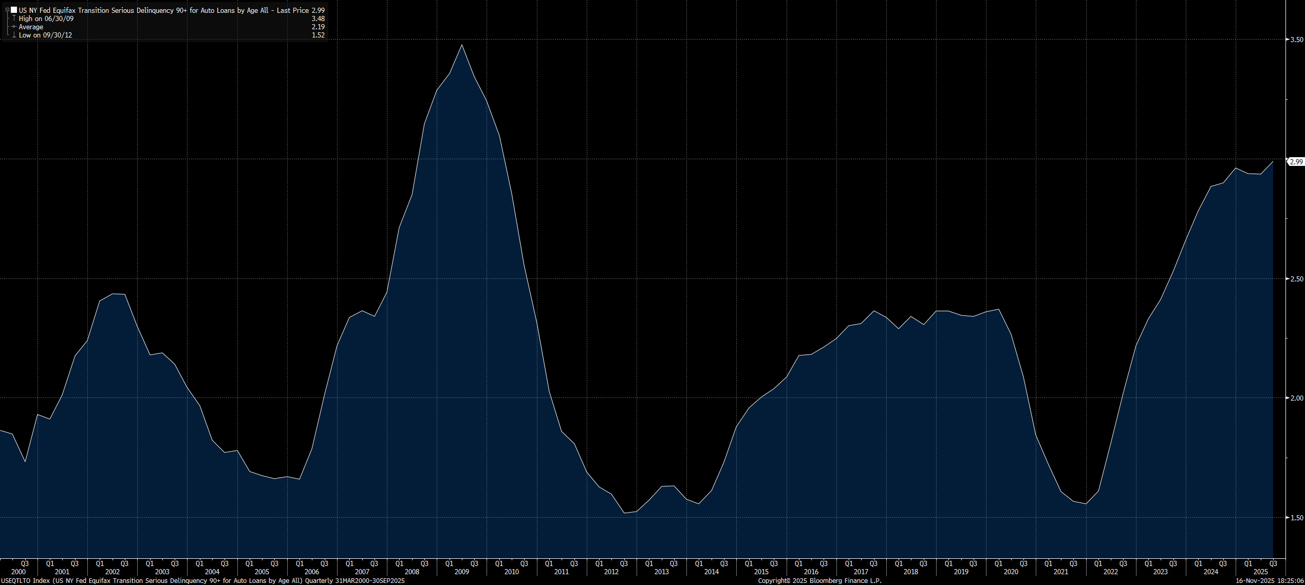 There is a real question emerging in macro around auto loan delinquencies. The implications matter because this could be signaling a deeper underlying issue. The data is unambiguous. Serious delinquencies in auto loans are rising across every age cohort. The real test is whether this stays isolated or whether it starts to bleed into the broader consumer and pull the equity market lower. And if it does have an impact, the real calculation becomes how much.