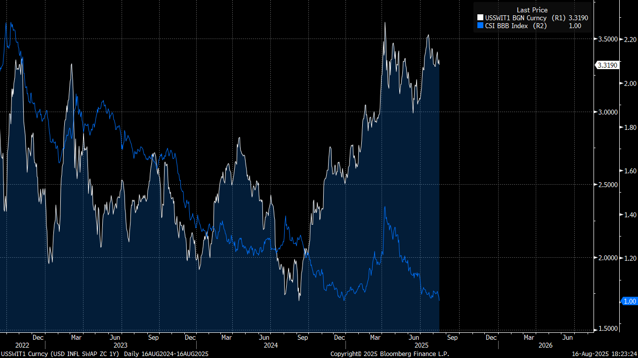 This sets the stage for Jackson Hole: the meeting is not just another communication point, but the venue where Powell will contextualize policy within this inflation-dominant regime. Markets are already expressing that tension in the forward curve, where rate cuts have been priced on the basis of growth risks, but the underlying reality is that inflation risk caps the Fed’s ability to deliver them (specifically, 2026 STIR pricing). The task for allocators this week is to read Jackson Hole as the re-framing moment that will either validate or challenge how the forward curve has priced the balance between growth fears and inflation credibility.