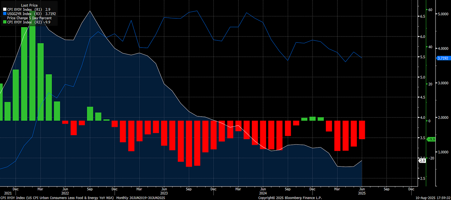 This chart illustrates how interest rates are inherently tied not just to the level of inflation, but also to its rate of change. The level of inflation anchors expectations to the Federal Reserve’s 2% target, framing the “destination” for policy. The rate of change, here shown as the 5-period lookback in core CPI, defines the “speed regime” — how quickly or slowly we are moving toward that destination. Markets extrapolate this speed: if inflation is decelerating by a known number of basis points per month, traders can estimate how many months it will take to reach a specific level. The 2-year yield in blue connects to the market’s pricing of this when, not just the where, meaning interest rates are continuously set based on where we are operating at the margin. This is why even small changes in the short-term momentum of inflation can disproportionately shift rate expectations — because they change the projected timeline to the target.