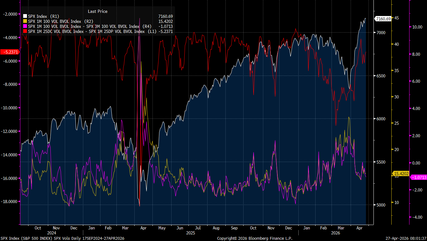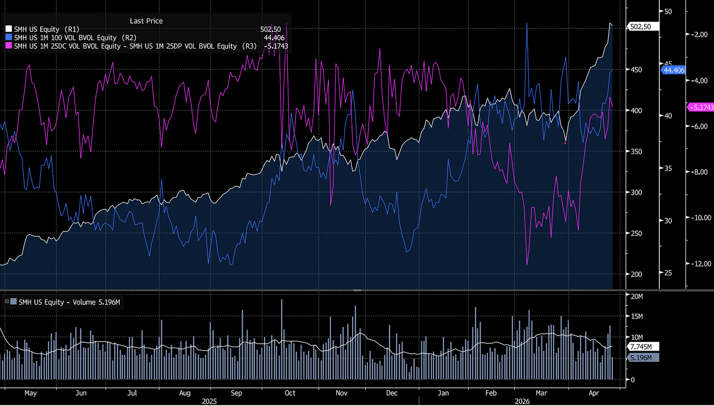 4. The IGV positioning unwind is the cleanest setup for the next leg of the melt-up. IGV implied vol is at the same level it was at the prior lows, but IGV has not made a new low. That is a massive divergence. Call skew is rising in SMH. If IGV starts squeezing to the upside, equity long-short positioning has to unwind both sides of the trade, which mechanically forces buying in IGV and potentially selling in SMH. Microsoft is holding key levels and is the third largest weight in the index. If Microsoft and the broader IGV complex squeezes, the entire NASDAQ melts up further. Software is half of tech, tech is thirty five percent of the index, and the unwind has not happened yet.