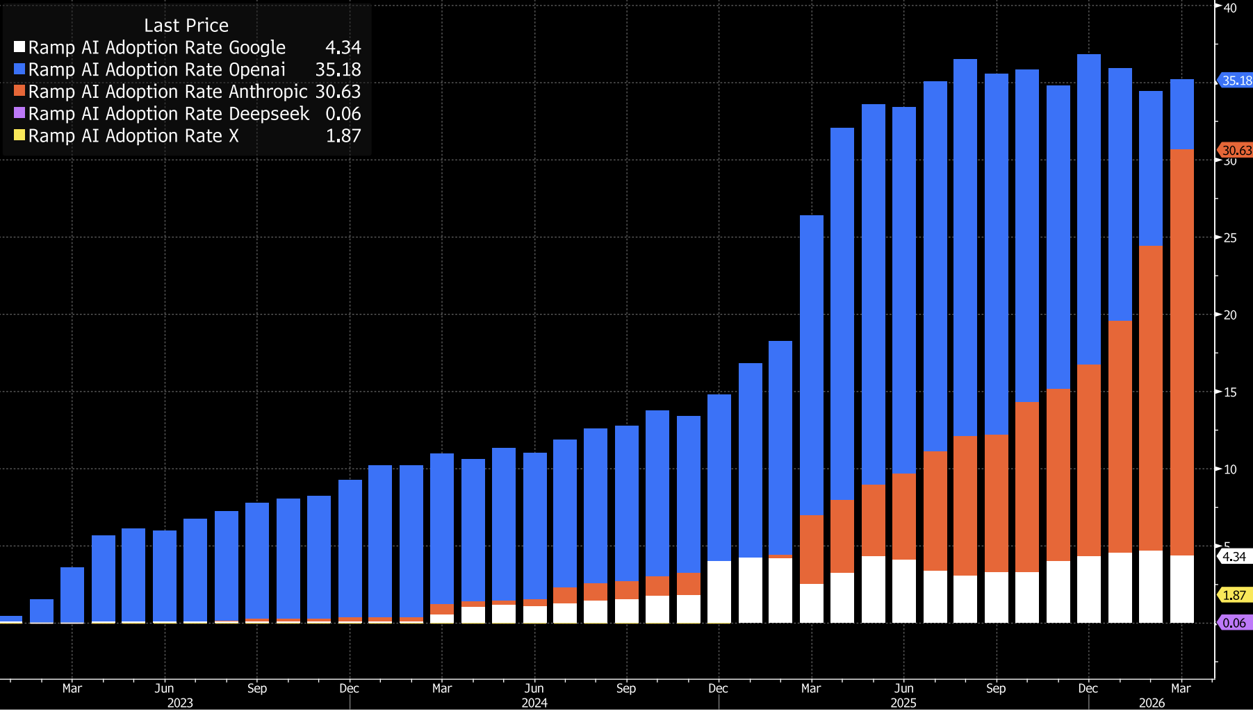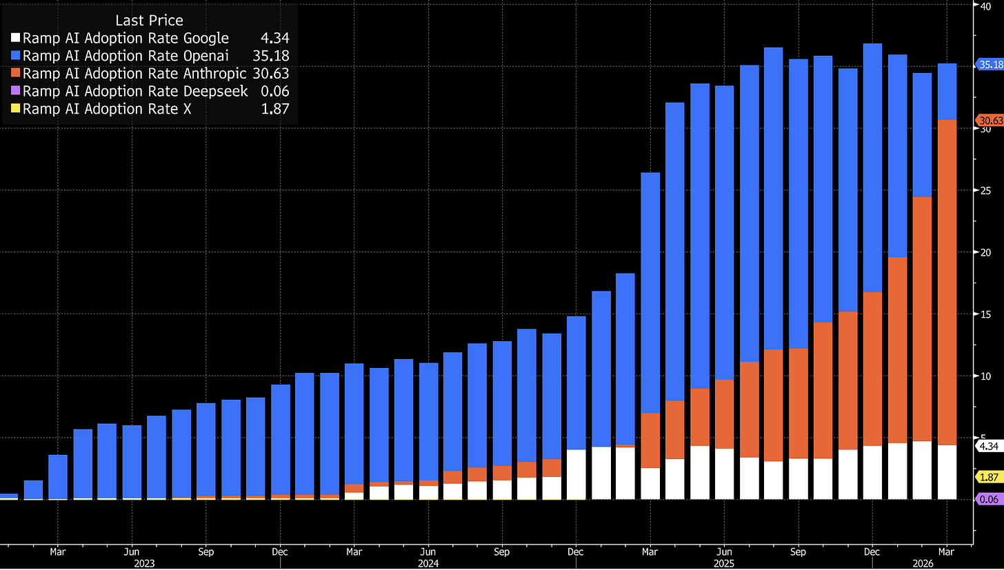 6. The Anthropic vs OpenAI market share chart is the most underpriced data set in the market. Anthropic is now at roughly thirty percent market share, just under OpenAI. The last two software-sector selloffs in IGV were caused by Anthropic and OpenAI model releases. With Anthropic gaining share and a higher IPO probability than OpenAI, the next inflection in the IPO window directly transmits into IGV positioning. This is why I am long Oracle. Larry Ellison hits the bid, sector flows turn, and the move compounds.