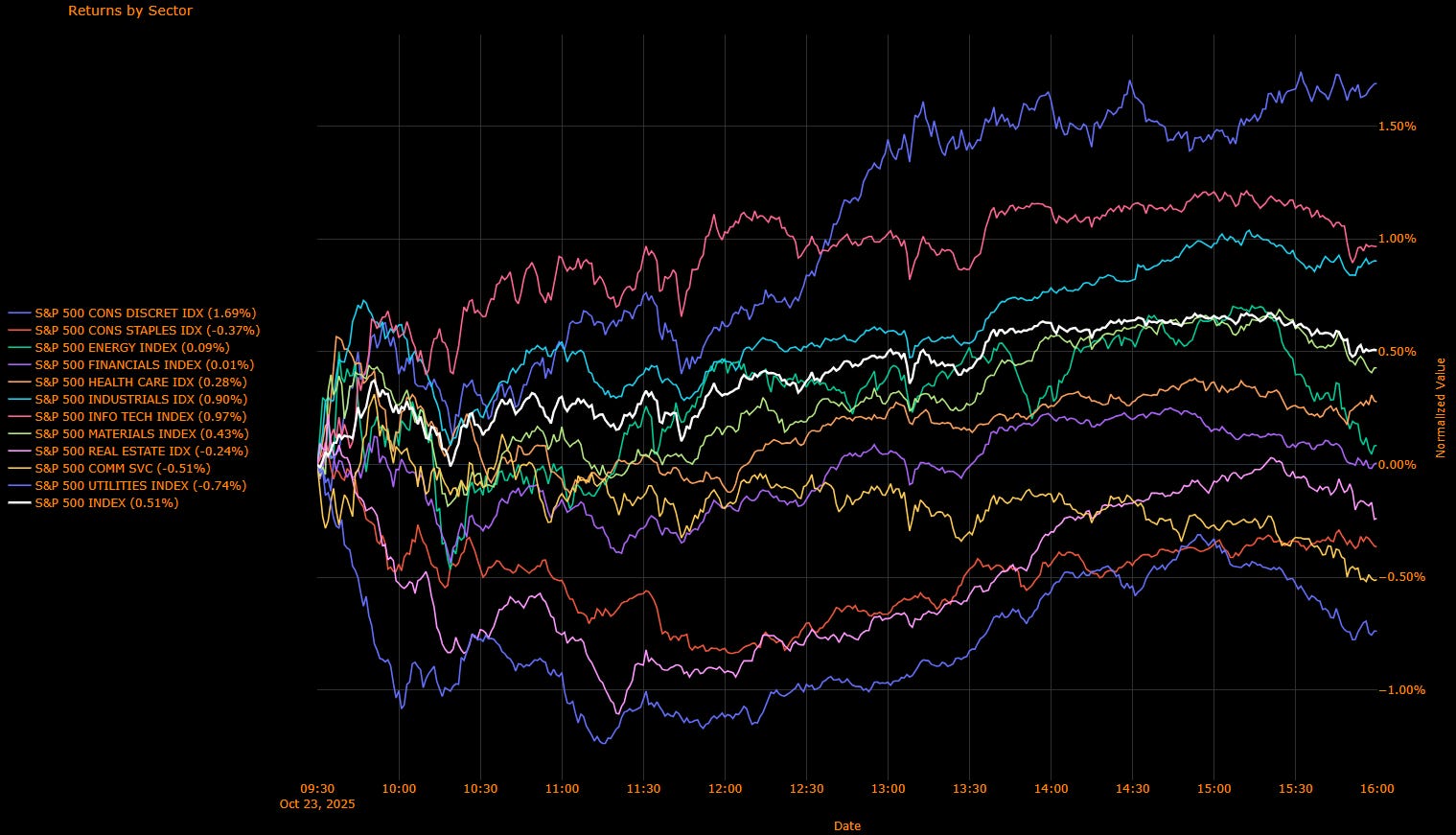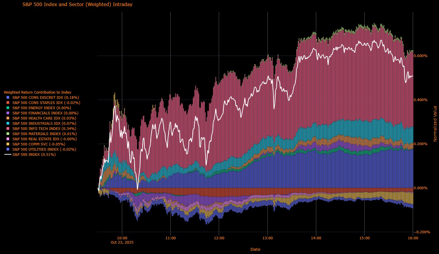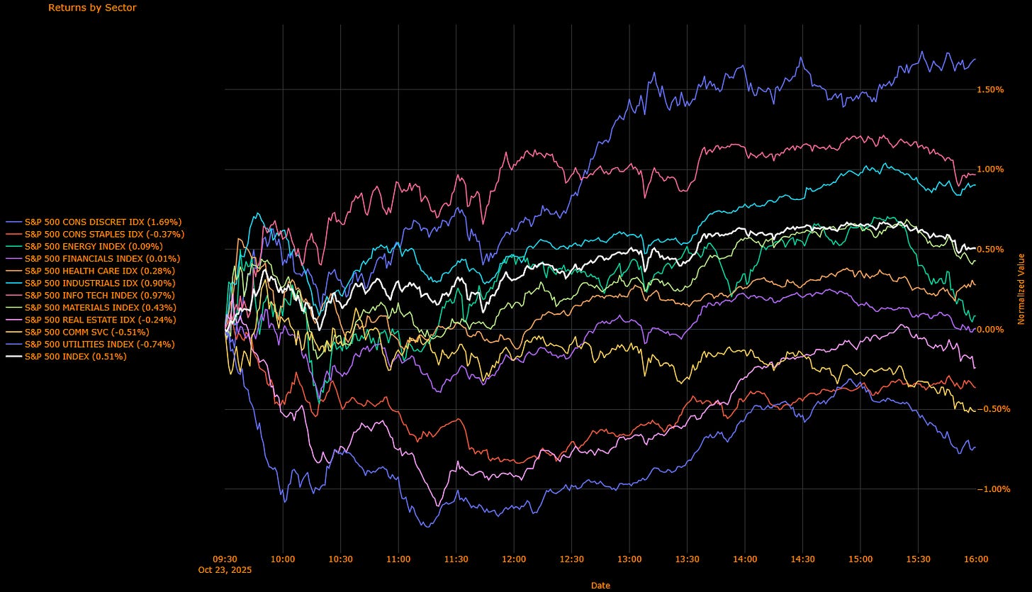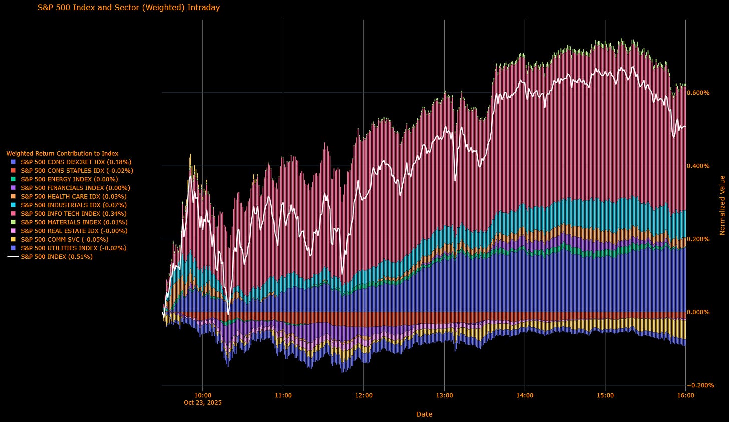 Read: Momentum and cyclicals drove the tape — Tech, Industrials, and Discretionary carried the load while defensives were unwound. The index advance was broad enough to offset small-cap softness and commodity volatility, suggesting positioning clean-up rather than fresh risk aversion.