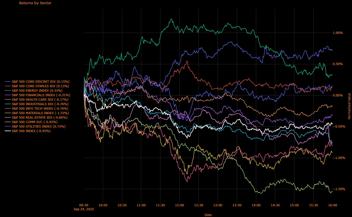 The S&P 500 slipped 0.45%, extending a mild pullback from recent records as stretched valuations and Powell’s “fairly highly valued” comment stirred consolidation talk. The selling was concentrated in cyclicals and tech, while defensives and energy offered a cushion. With investors already near max exposure after a 35% rally off April’s lows, positioning risks are compounding into September’s seasonal weakness.