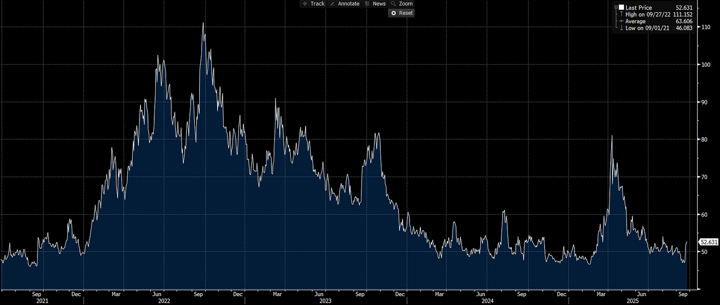 IG spreads nudged wider but stayed comfortably in the carry zone. Bloomberg US IG OAS printed ~52.6 bp (chart last: 52.631), up a hair from the low-52s and still far from stress. The move came alongside a consolidation in equities, a firmer dollar, higher Treasury yields, and chunky primary supply—enough friction to stall the recent grind tighter, not enough to re-price the asset class.