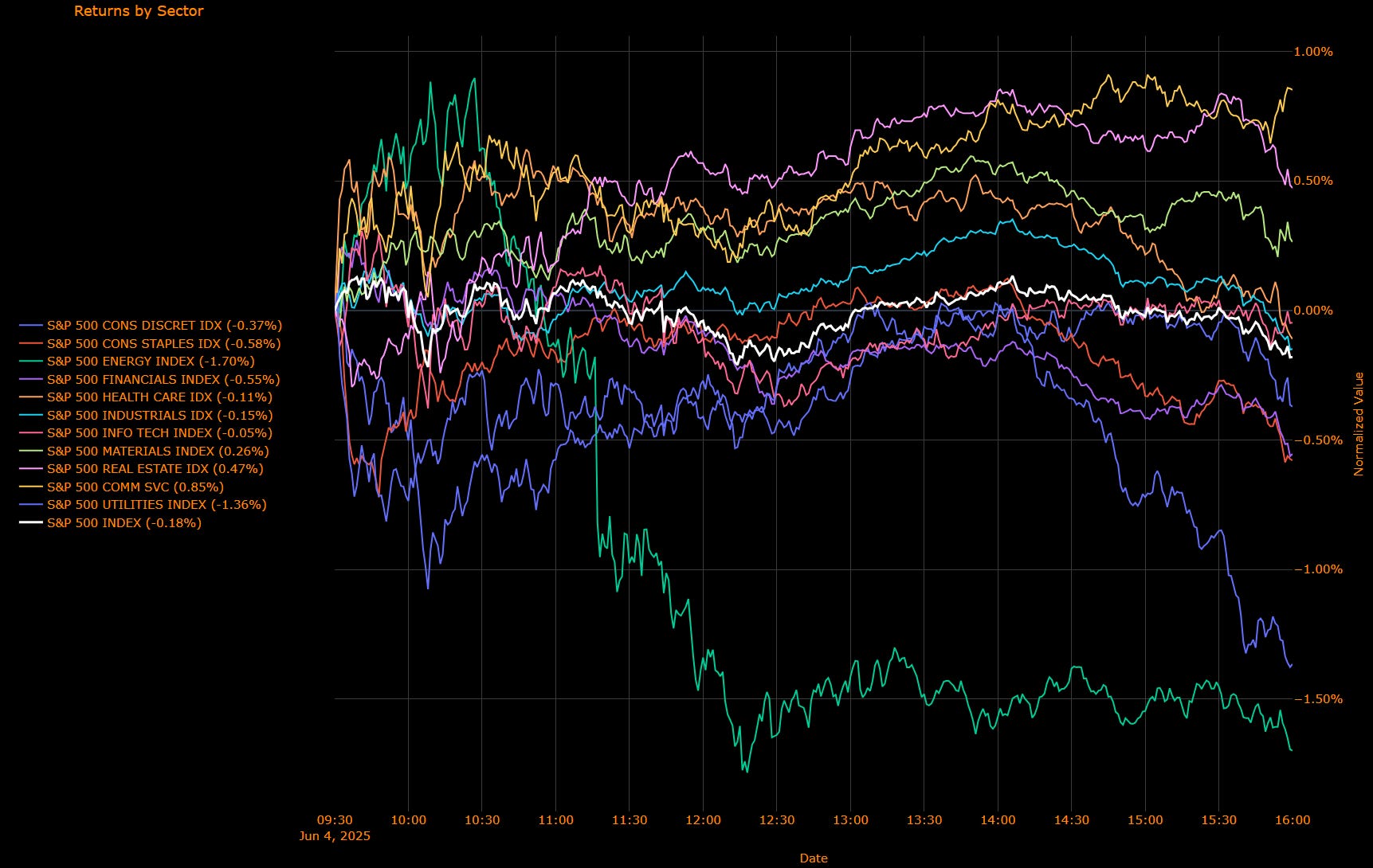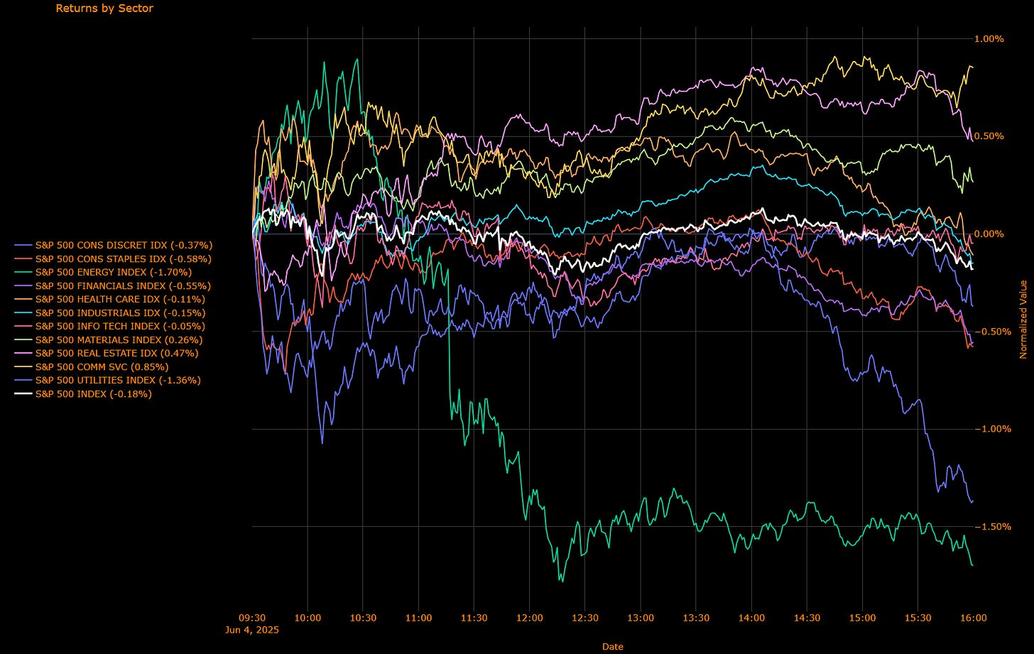 Materials (+0.26%) – Modestly higher, reflecting stable demand for commodities despite broader economic concerns.