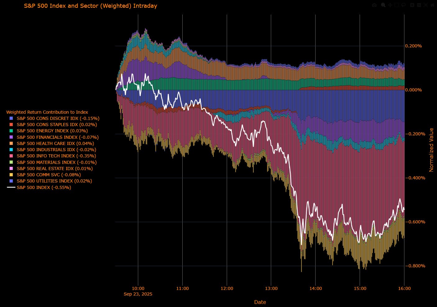 Biggest drag: Information Technology (–0.35%), driving most of the S&P’s decline.