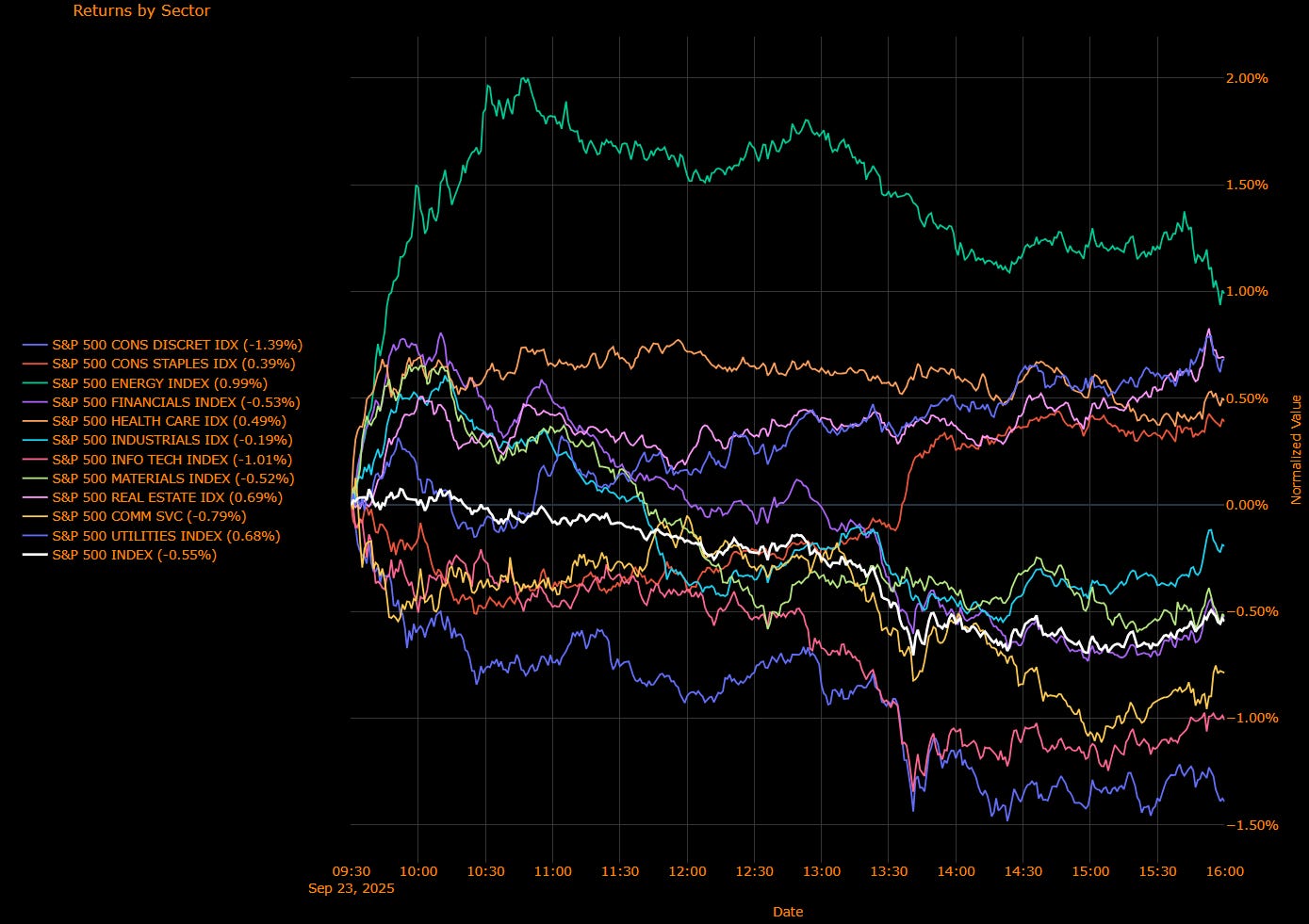 Tech (–1.01%) and Consumer Discretionary (–1.39%) bore the brunt of the selling, alongside Communication Services (–0.79%).