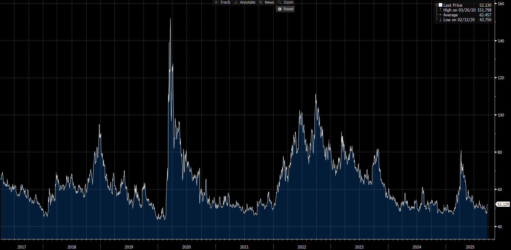 Read: Low-50s regime = carry positive with room for two-way around data/issuance.