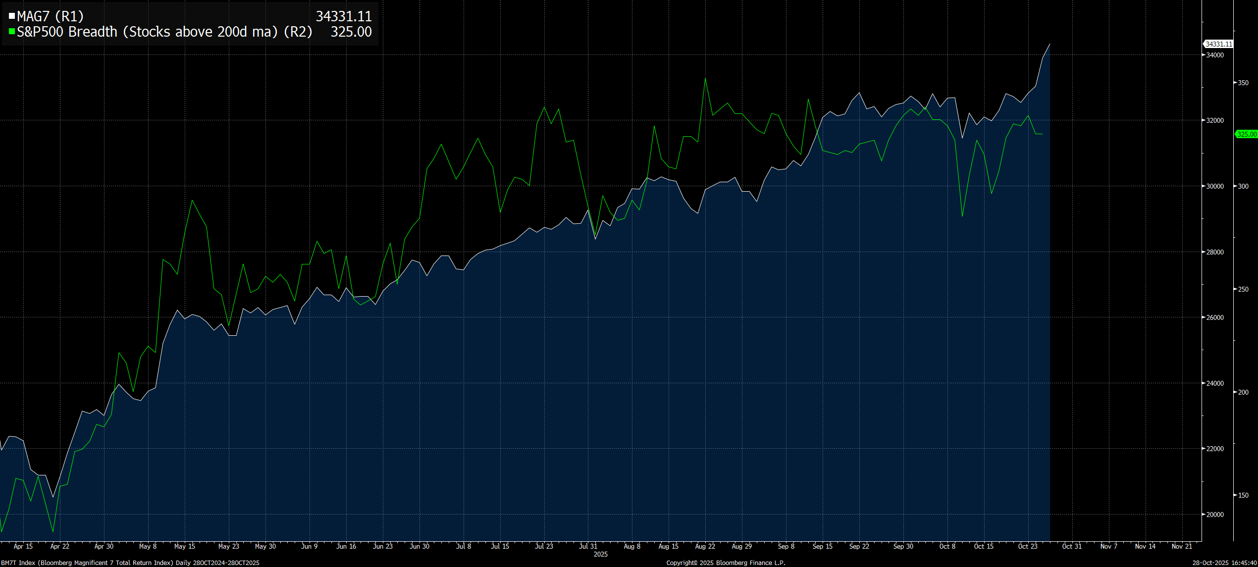 1. Narrow leadership: The rally’s dependency on Tech is deepening, breadth deterioration despite record-high prints signals fragility beneath the index.