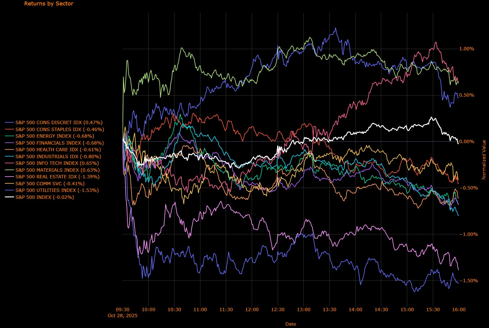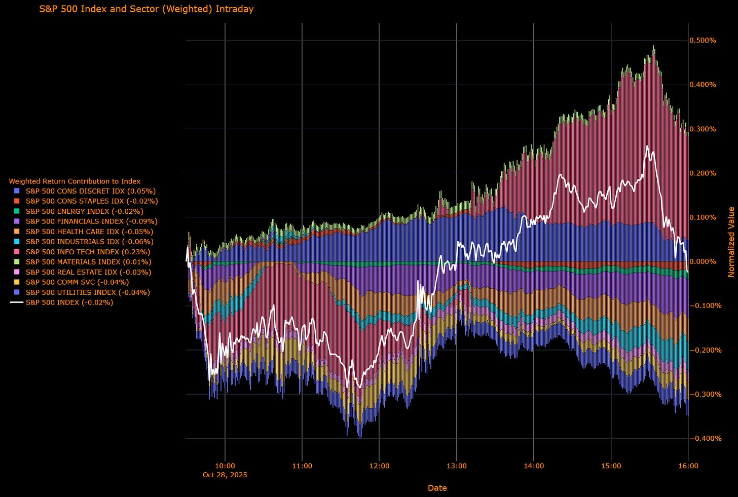 A flat index that hides a hollow advance, Tech’s strength offset broad sector weakness. Markets are holding steady into the dual catalysts of Fed guidance and Big Tech earnings. The next move hinges on whether policy reassurance and profit momentum can reignite breadth or whether leadership concentration tightens further.