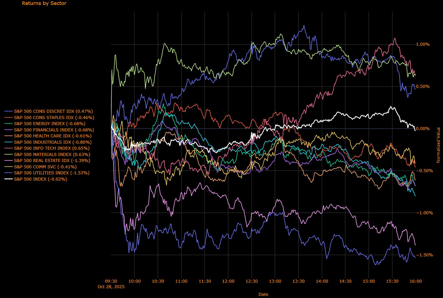 Markets traded sideways into Wednesday’s Fed decision and a critical stretch of megacap tech earnings. The S&P 500 ended marginally lower (−0.02%), masking a sharp dispersion beneath the surface: Tech strength kept the tape afloat, while defensives and interest-sensitive sectors extended declines. Liquidity stayed ample and rates were contained, but breadth deteriorated again, nearly 400 stocks fell on the day.