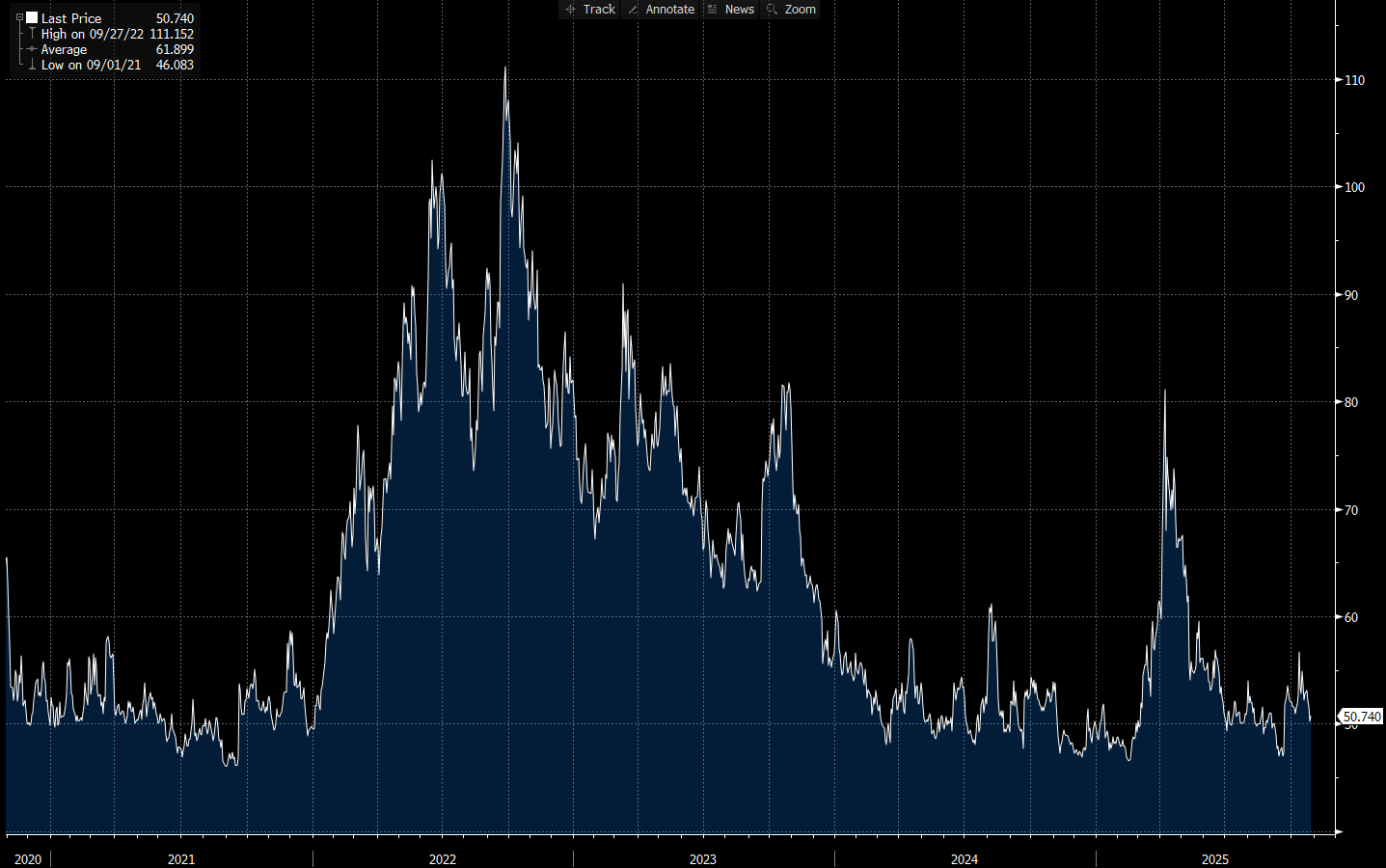 WTI around $60 after a three-day slide; stable energy prices remove inflation anxiety and support the Fed’s latitude to cut. Oil’s round-trip from mid-60s to low-60s helped Energy credit remain resilient, no sectoral spread contagion.