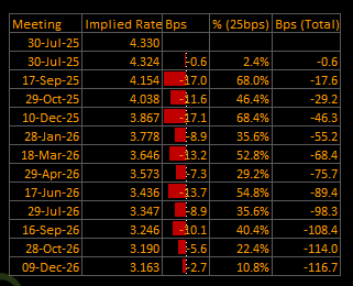 The short-end continues to lean dovish, with the total implied rate cuts expanding to –116.7 bp, up from –107.3 bp just a day ago. Traders are now pricing nearly five full cuts between now and the end of 2026, with a 68% chance of easing by September. What looked like a plateau in rate expectations has quietly become a slide slow, but firm as macro risks accumulate and confidence in the soft landing narrative begins to fray.