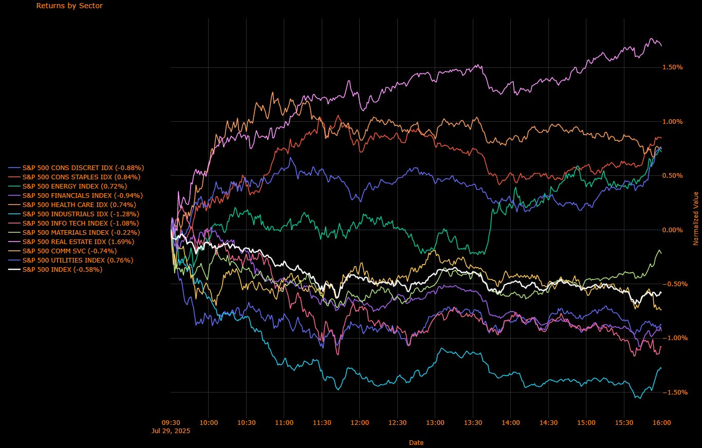 The collapse in Tech and Financials coincided with fresh ambiguity from tariff talks. Bessent confirmed that no extension is guaranteed, and while the mood was "constructive," Beijing appears to have prematurely floated a 90-day pause. This leaves traders exposed heading into both the Fed decision, QRA, and earnings from Big Tech… all within a 48-hour window.