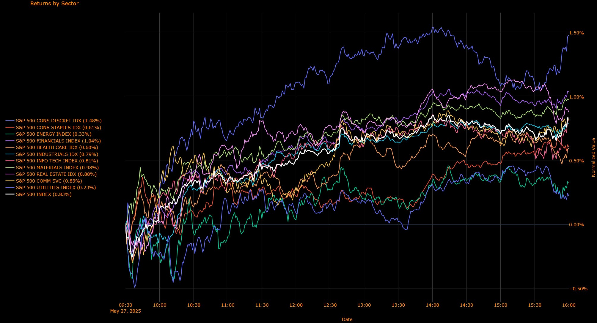 Utilities (+0.01 pp) – Slight positive contribution, often a defensive sector, showing marginal gains amidst broader market strength.