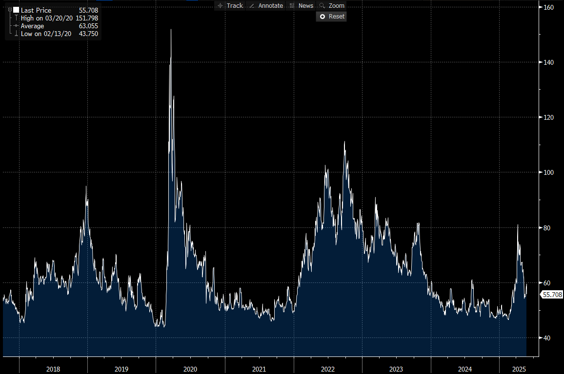 IG credit spreads have tightened to 55.7 bp, reflecting reduced immediate trade war concerns and improved macroeconomic data. Near-term volatility risks have decreased from recent highs, influenced by the tariff delay and positive consumer sentiment. Directional bias remains cautiously skewed toward stability or further tightening in the short term, provided no new significant negative catalysts emerge.