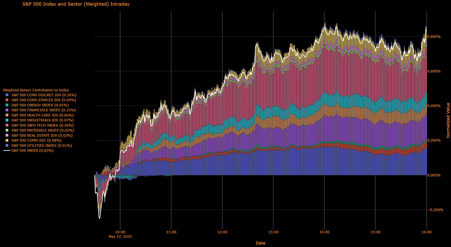 The S&P 500 advanced +0.83%, primarily driven by performance in Information Technology and Consumer Discretionary sectors. The delay in EU tariffs and an increase in consumer confidence were contributing factors. Utilities and Energy sectors exhibited relatively more subdued performance. Despite positive overnight developments, macroeconomic uncertainties and the potential for future tariff risks suggest ongoing market volatility.
