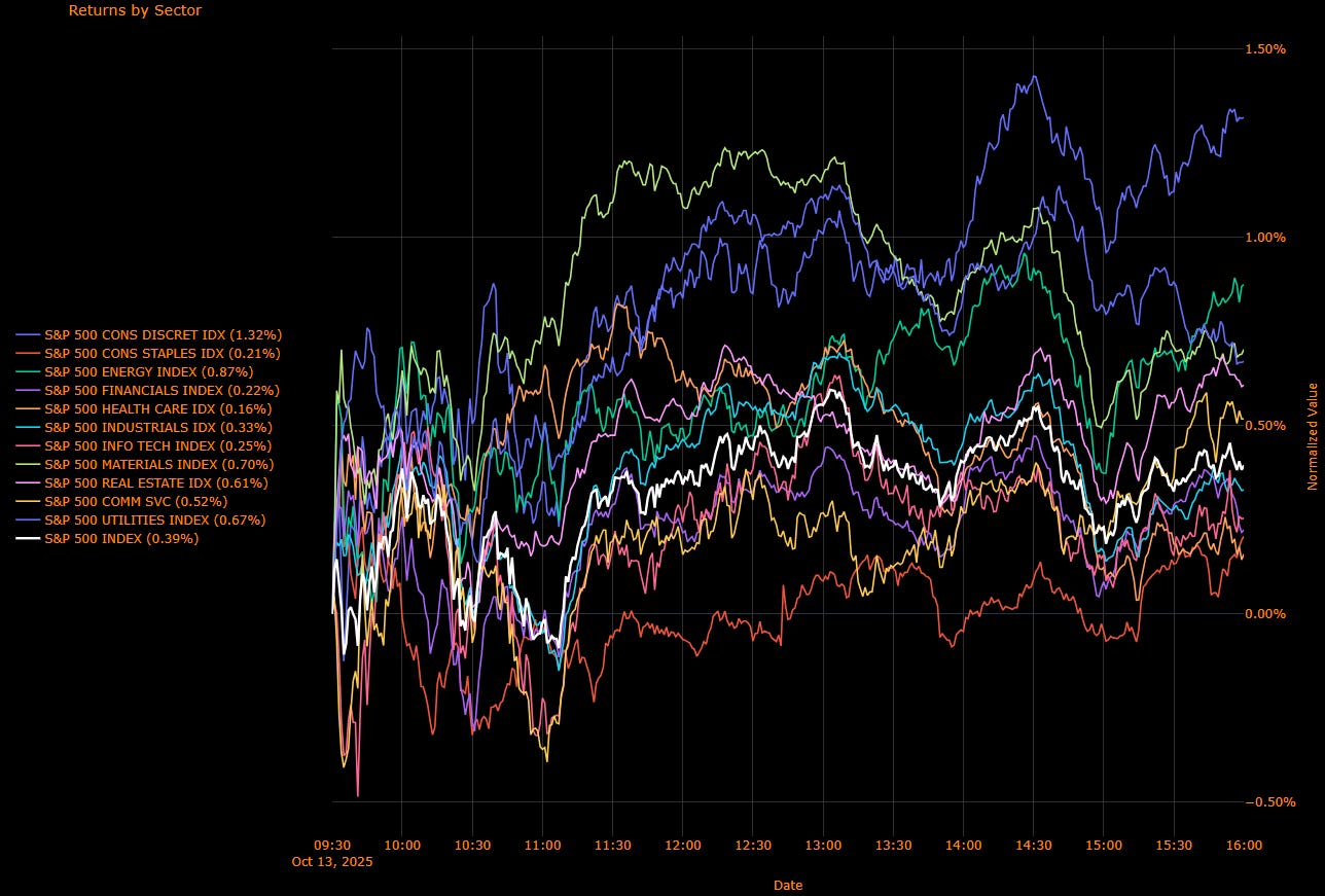 Gains were broad but not euphoric. Consumer Discretionary (+1.32%), Energy (+0.87%), and Materials (+0.70%) led the charge as cyclical risk appetite returned. Utilities (+0.67%) and Real Estate (+0.61%) rounded out the gainers, reflecting a subtle bid for yield defensives even as growth rallied. Tech (+0.25%) lagged the headline narrative but dominated by weight. The S&P 500 rose 0.39% on a cap-weighted basis.