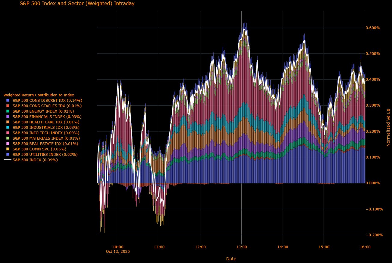 Markets rebounded sharply as traders reversed Monday’s tariff-driven sell-off, embracing signs of renewed diplomacy between Washington and Beijing. President Trump’s administration hinted at “openness to a deal,” while China’s Commerce Ministry echoed calls for further talks, enough to unwind the prior session’s panic. The move was turbo-charged by an AI-led melt-up: Broadcom (+10%) soared after striking a multiyear chip-supply deal with OpenAI, reigniting the semiconductor complex (+5%) and restoring confidence in the bull market’s tech backbone.