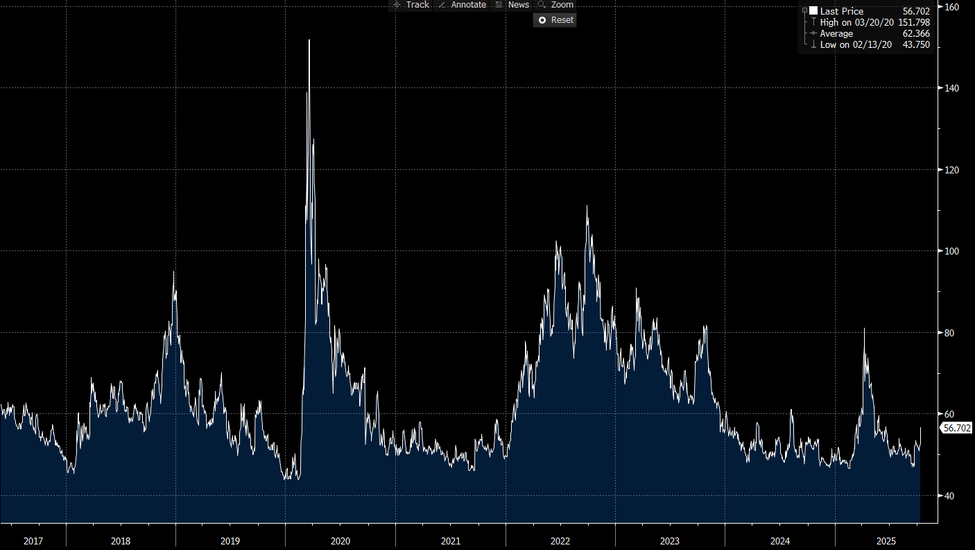 (Chart stats: Last ~56.7 | High 151.8 on 03/20/20 | Avg 62.37 | Low 43.75 on 02/13/20.)