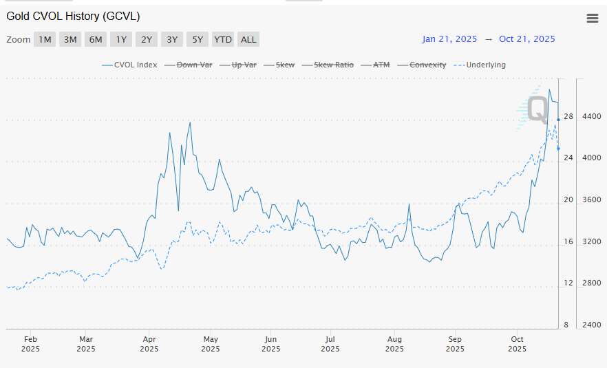 Today, gold and silver sold off marginally but this was primarily driven by positioning as opposed to a fundamental macro shift. Notice that implied vol has blown out in gold as traders are paying a massive premium for calls. In simple terms, short-term positioning is paying a massive premium, so the 5% pullback today was not incredibly surprising after being up almost 60% YTD: