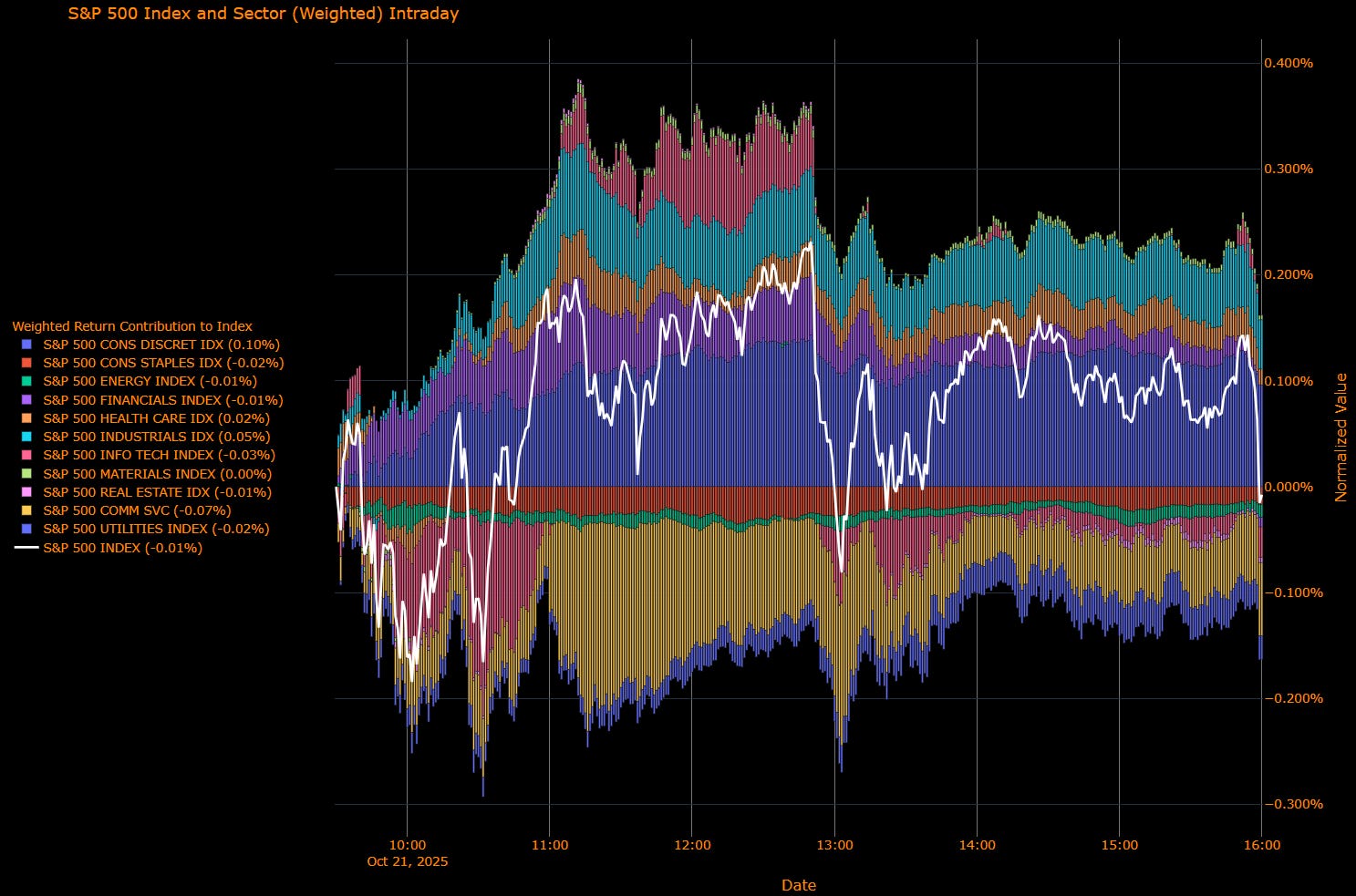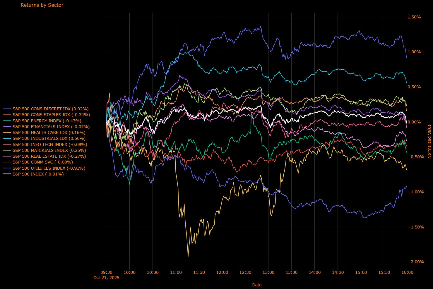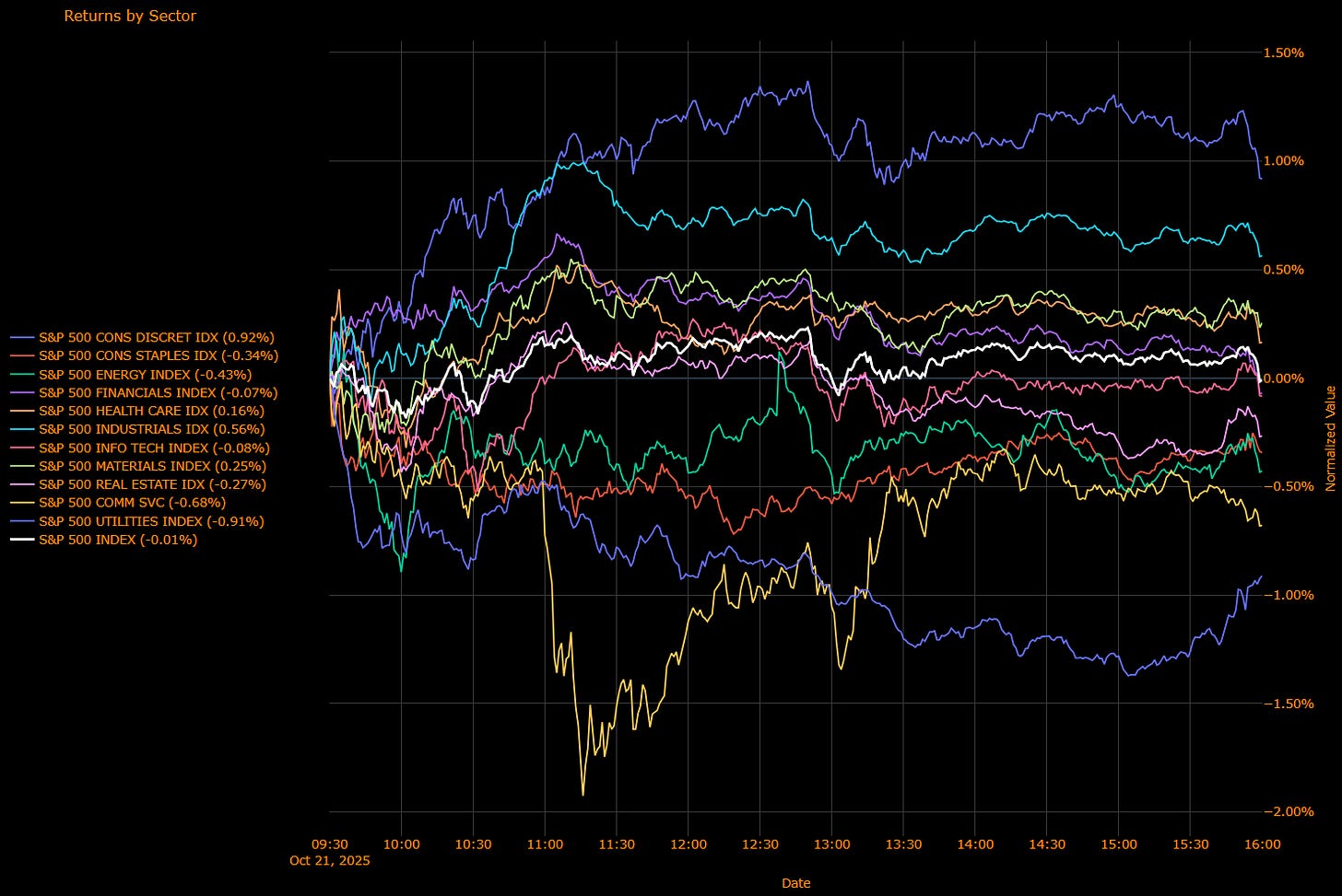 Read: The index held up on cyclical Discretionary/Industrials while classic defensives (Utilities/Staples/REITs) and Comm Services weighed; Tech slipped at the margin. Breadth was positive in pro-growth pockets but defensives were a clear headwind.