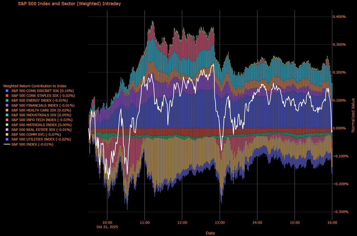Cyclicals doing the holding: Discretionary/Industrials leadership with Tech soft says “growth/animal spirits” > pure rates beta on the day.