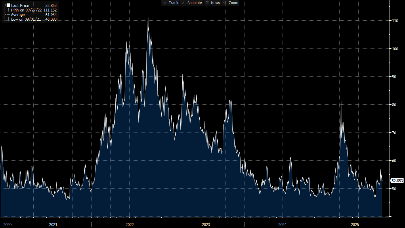 Base case: The 50–60 bp corral remains the center of gravity. With rates contained and earnings broadly fine, grind-tighter bias persists toward the high-40s only if macro stays calm.