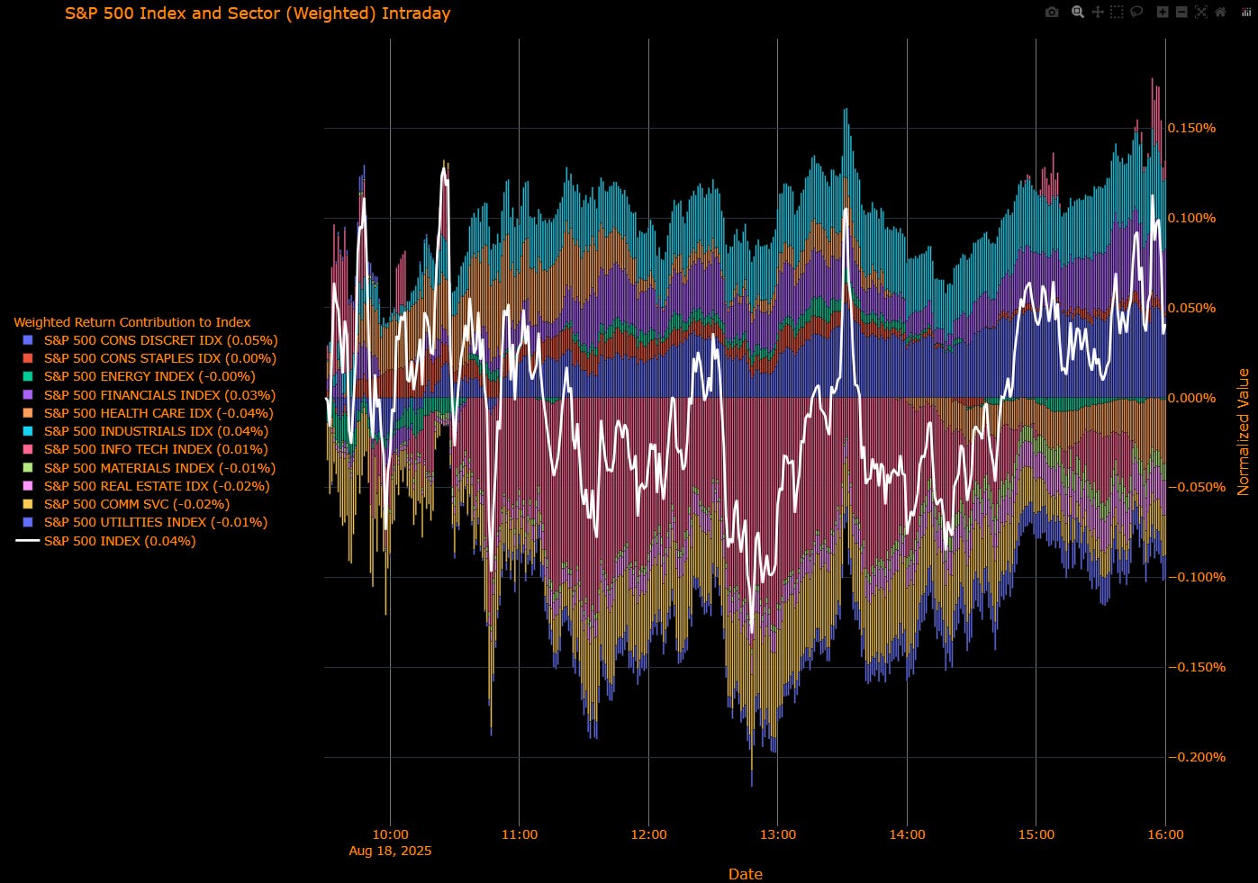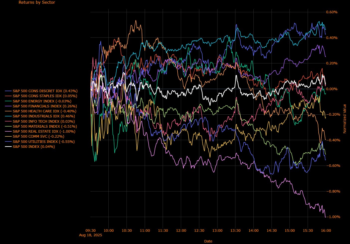 Today’s tape was a classic pre-event drift: cyclicals (Industrials/Discretionary) did the lifting, defensives (REITs/Utilities/Health Care) faded, and the index netted a rounding-error gain.