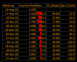 The front end remains locked on a “cautious cut” opener. Versus yesterday, the curve is essentially unchanged: a 25 bp September move is still the base case, the terminal sits ~3.05%, and the total path to Jan ’27 holds at ~–128 bp.