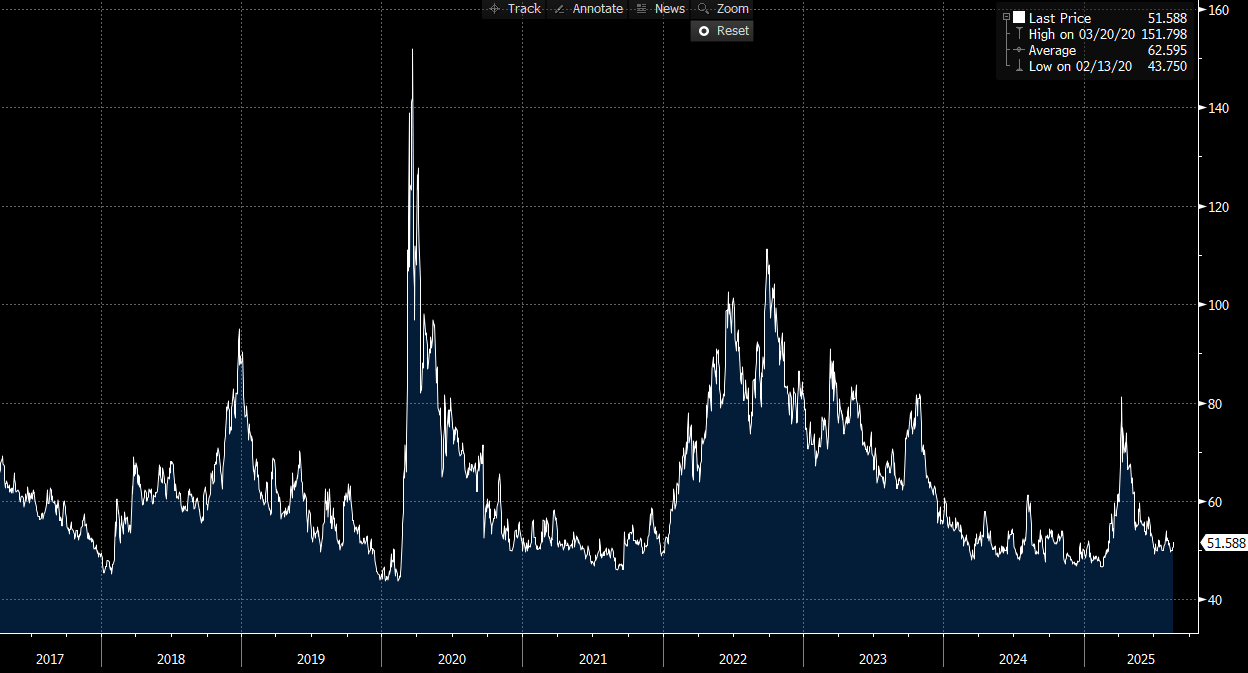 Spreads held the low-50s despite a rates backup—classic carry regime. Credit beta stayed orderly even as equities slipped and the dollar firmed.