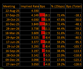 The front end nudged shallower versus yesterday: the total path eases to –128.0 bp (from –130.5 bp) and the terminal ticks up +2½ bp. September remains a 25 bp base case but with softer odds (~76% vs low-80s). By 10-Dec-25 the curve embeds –48.6 bp, reaches –95.7 bp by 17-Jun-26, and finishes –128.0 bp by 27-Jan-27. Cadence still reads “step-downs through 1H26, then lighter trims into late-26/early-27.”