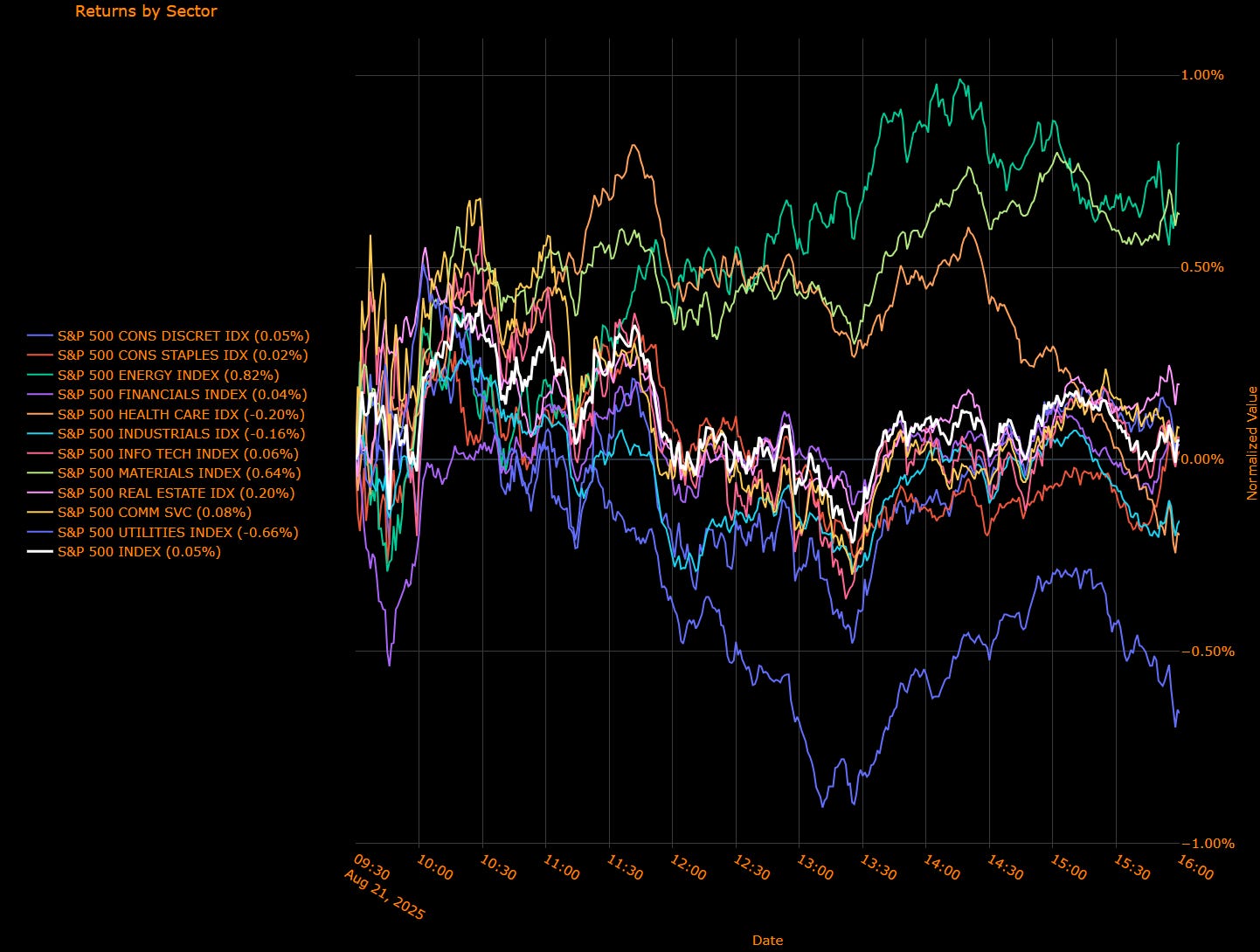 The S&P 500 finished essentially unchanged at +0.05% as traders trimmed September-cut odds into Jackson Hole on firmer PMIs and hawkish Fed chatter. Yields backed up, the dollar firmed, and leadership flipped toward Energy/Materials while classic defensives lagged.