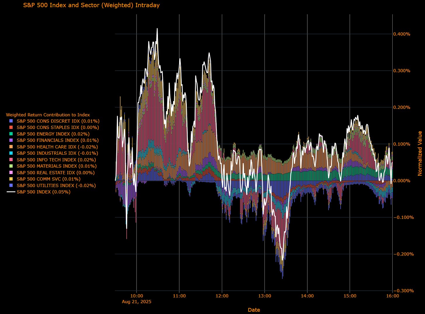 Offsets: Energy (+0.02%), Information Technology (+0.02%), Financials (+0.01%), Materials (+0.01%), Consumer Discretionary (+0.01%), Communication Services (+0.01%), Consumer Staples (0.00%), Real Estate (0.00%).