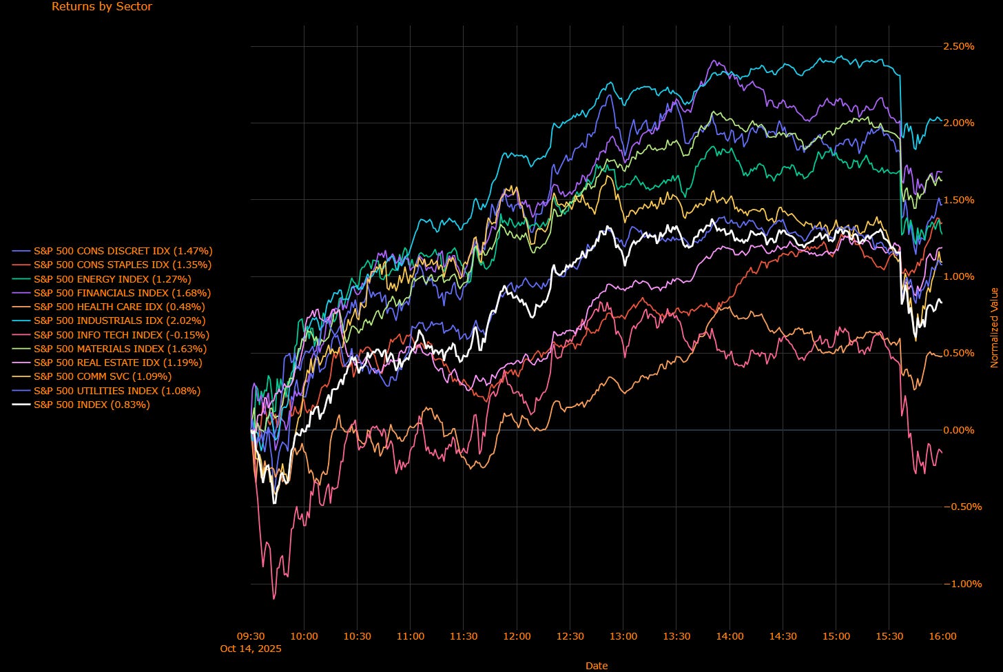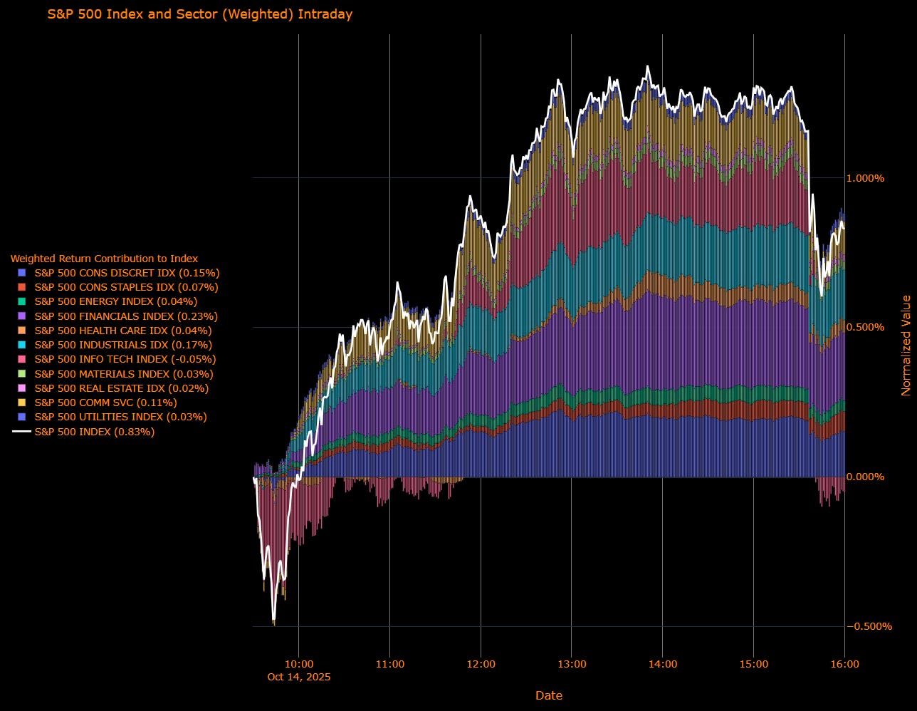 Leadership came from Financials (+0.23%), Industrials (+0.17%), and Consumer Discretionary (+0.15%), together accounting for roughly two-thirds of the index’s move. Communication Services (+0.11%) added follow-through momentum, while Energy, Health Care, and Staples each chipped in modestly (~ +0.04–0.07%). Technology lagged slightly (–0.05%) as the AI trade paused for breath.