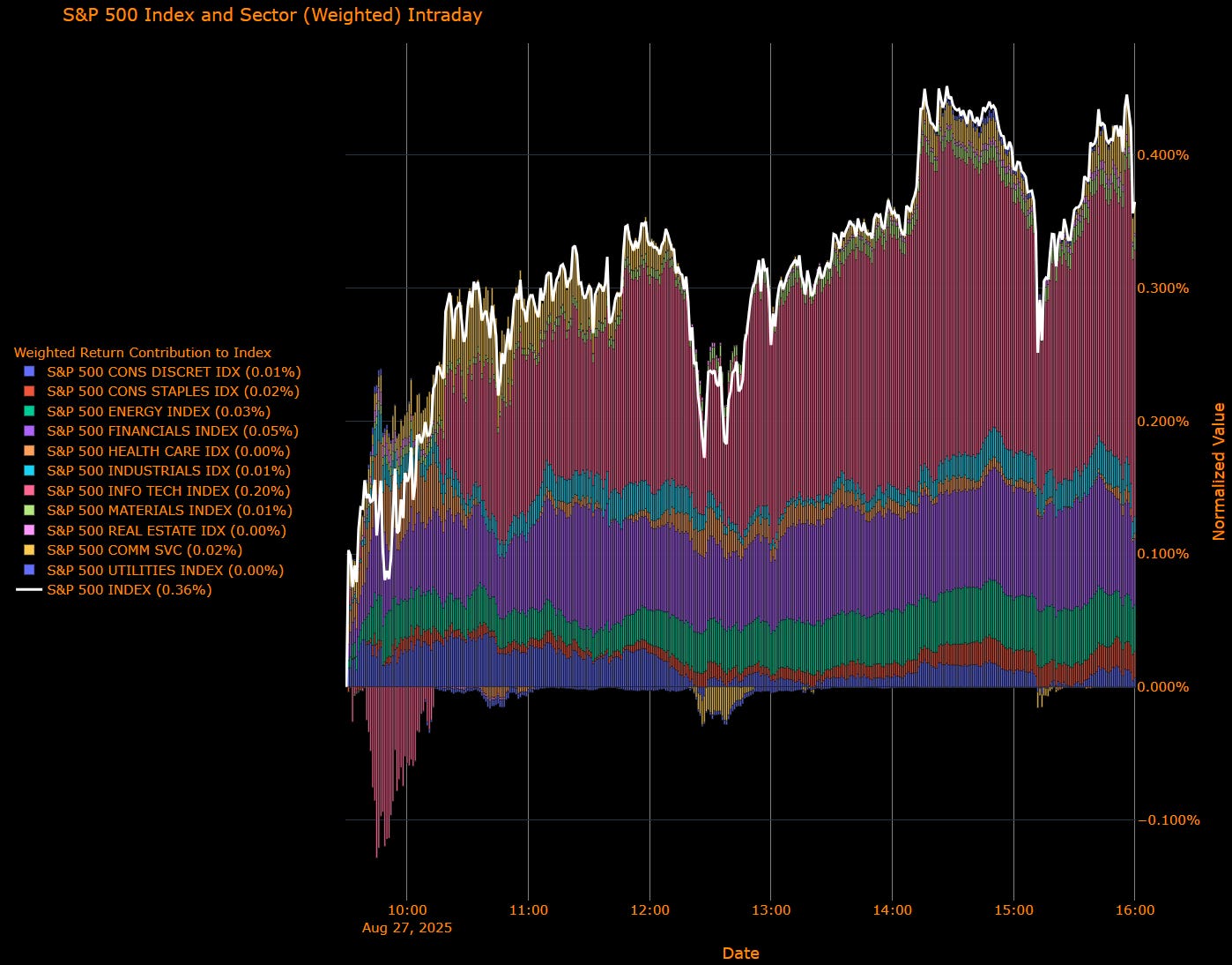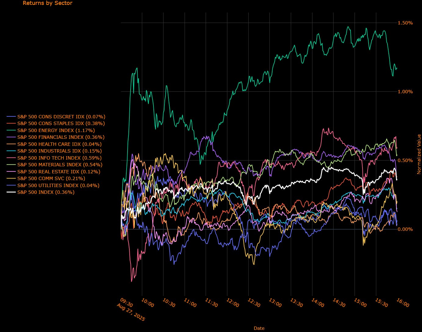 Laggards: Real Estate (+0.12%), Consumer Discretionary (+0.07%), Health Care (+0.04%), Utilities (+0.04%).