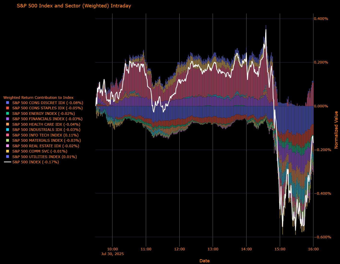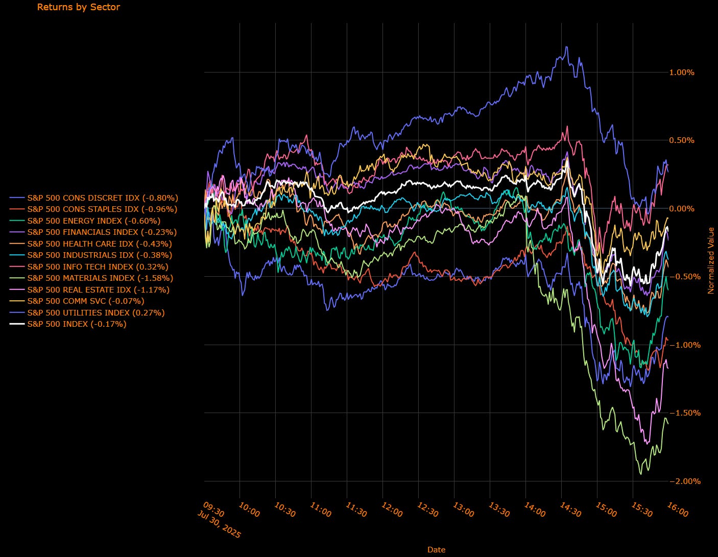 The S&P 500 slipped 0.17% on Wednesday, masking a much messier session beneath the surface. A sharp sector divergence saw Tech prop up the index thanks to strong earnings from Microsoft and Meta, but nearly every other sector traded lower, as risk appetite faltered into a triple threat of Fed, tariffs, and softening demand signals.